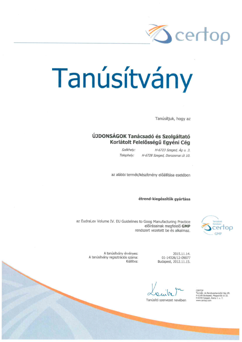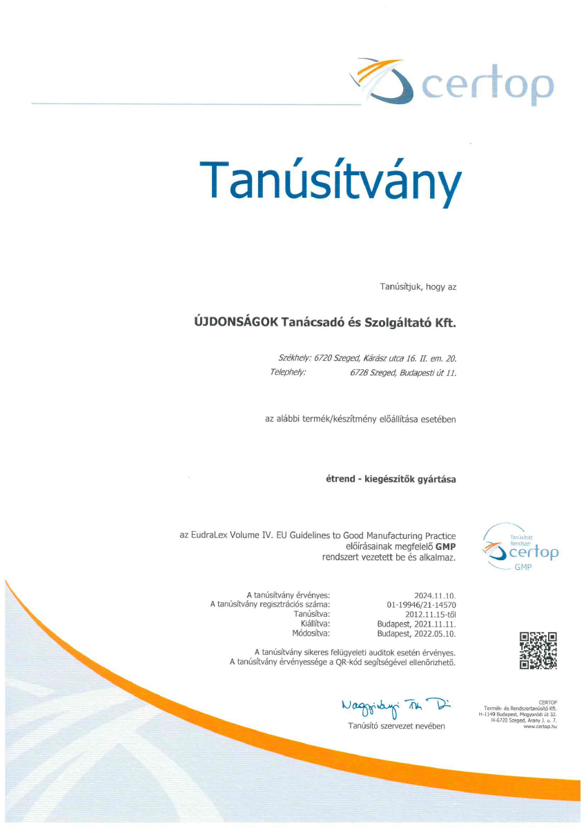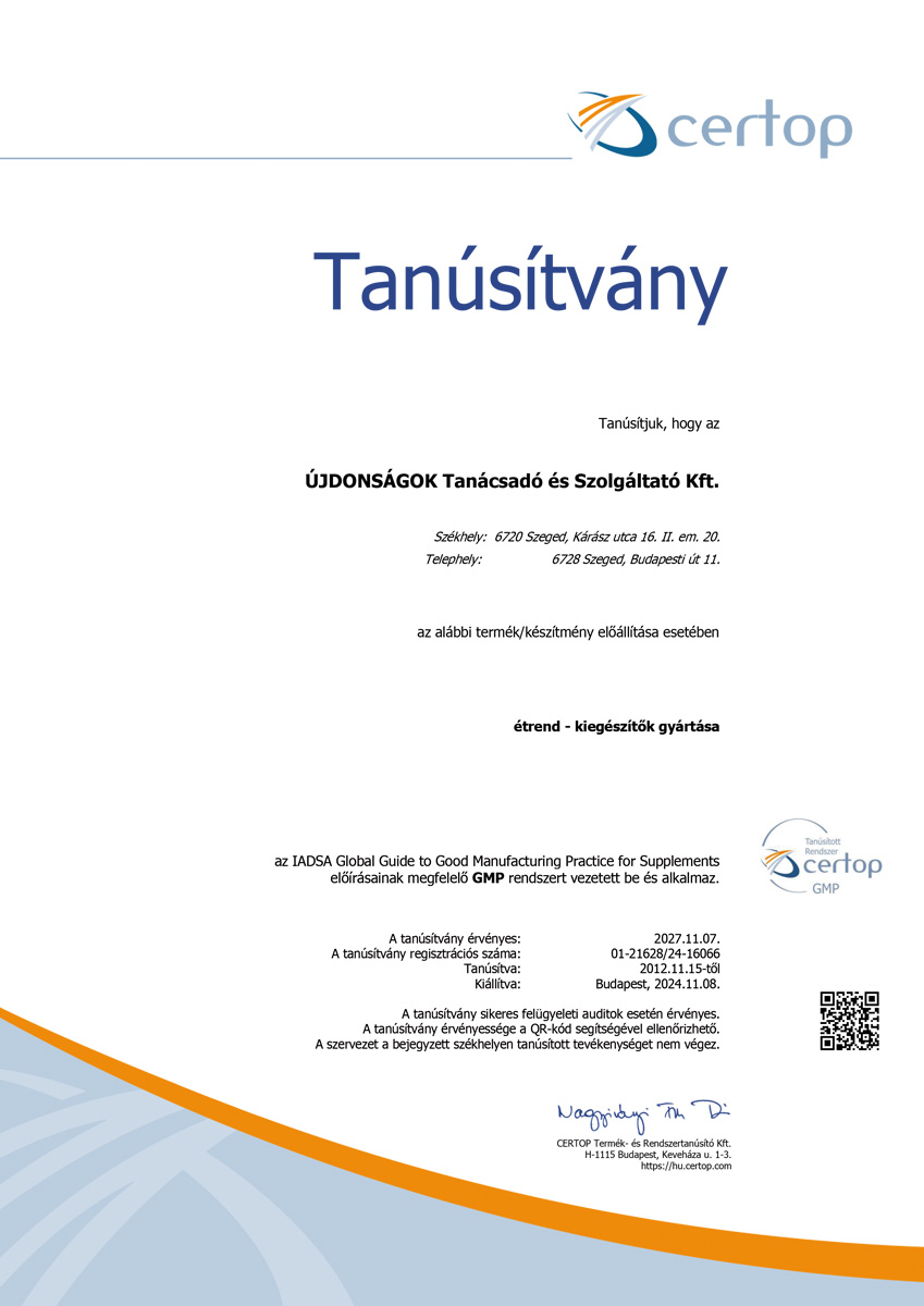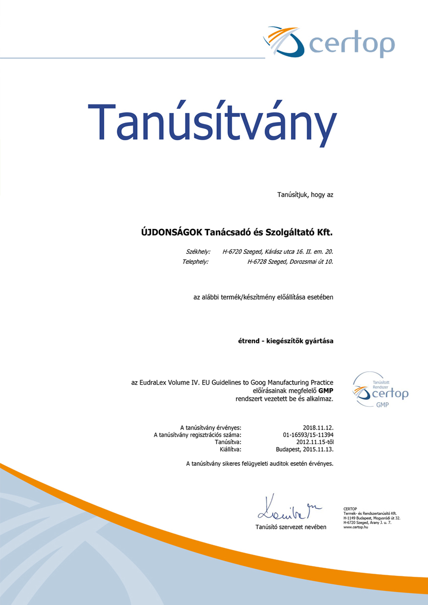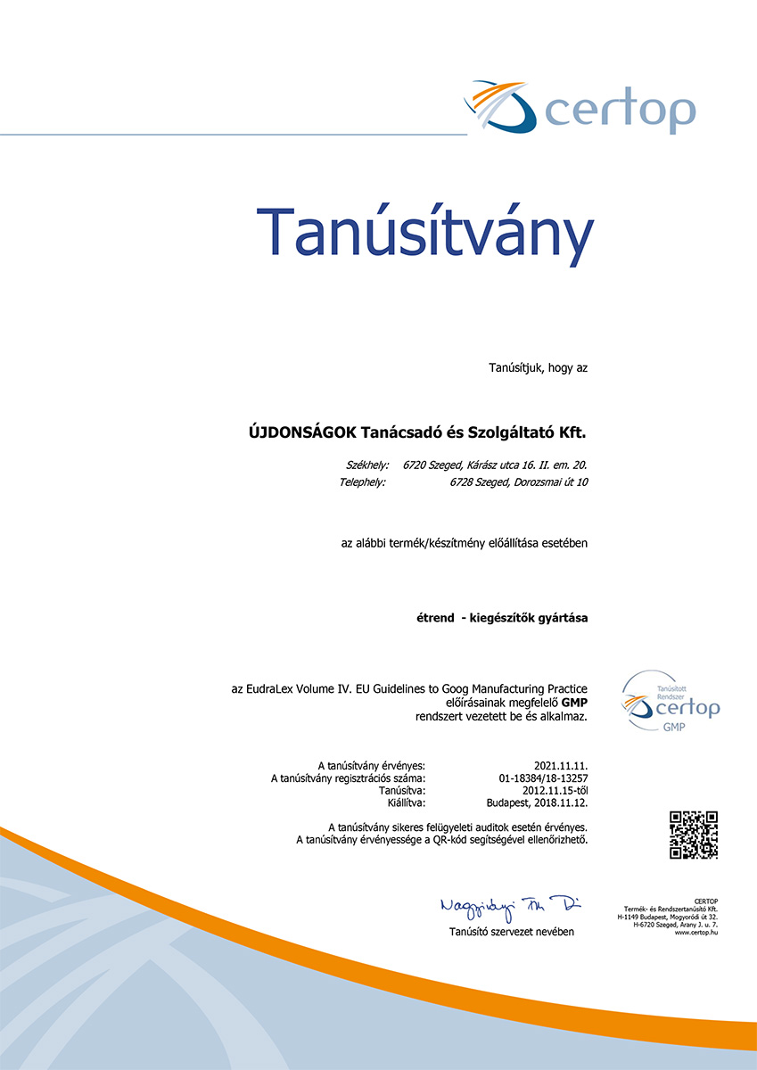 Az N.I.C.S. termékek gyártását biztosító üzem 2022-ben már a 11. alkalommal kapta meg a GMP (Good Manufacturing Practice), azaz a ˝jó gyártási gyakorlat˝szerinti minősítést. A GMP egy nemzetközileg is egységesen elfogadott, megbízható és nyomonkövethető eljárásrend, amelyben a termékbiztonság és az egyenletes termékminőség érdekében az alkalmazható leghatékonyabb irányelveket, gyártási műveleteket és ellenőrzési módszereket gyűjtik össze. Általában a gyógyszer- és élelmiszeriparban alkalmazzák. Az üzemek megfelelőségét az Európai Unióban a nemzeti szabályozó ügynökségek audit keretében minden évben ellenőrzik.