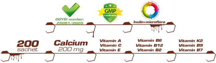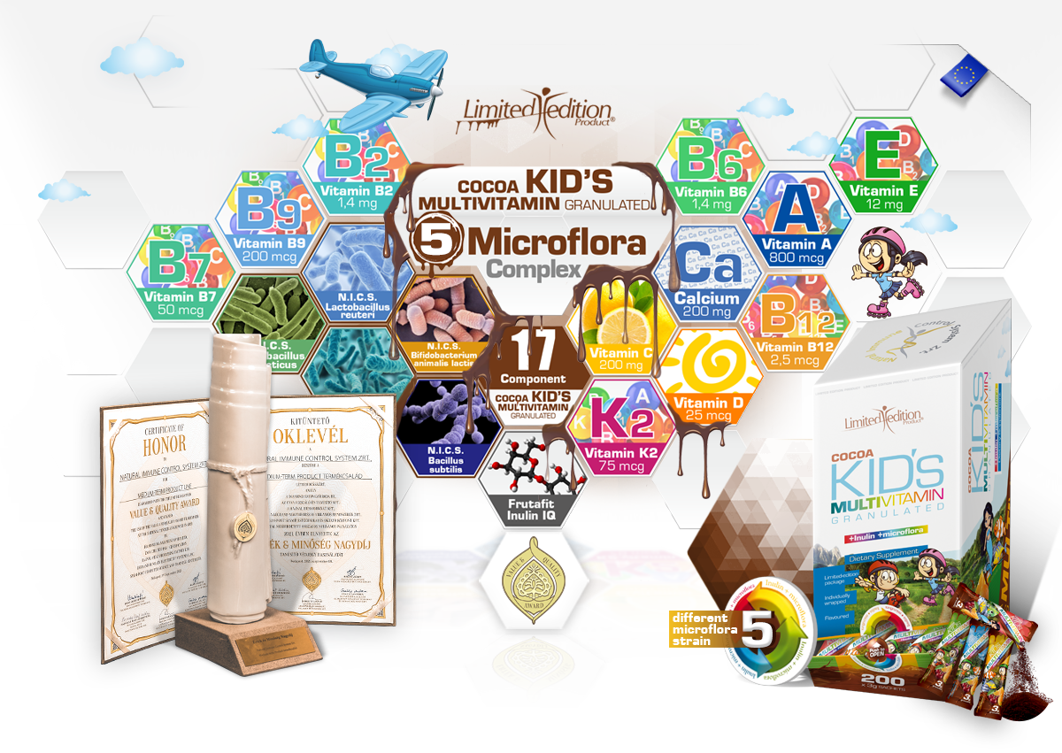 As an innovation we have completed our family of granules with a limited edition product. We have developed a brand new, cocoa taste to make the vitamin consumption even more enjoyable for those who are the most important for us, for our children. Regarding the vitamin and mineral content we insisted on the foregoing proven content of the OYP Kid’s Multivitamin. We supplemented these not with the microflora strains known from our One Year Products but with the specially selected microflora strains distinguished by NICS prefix in their name to ensure the possibility by consuming alternately or combined to support the body with 11 different type of microflora strains.