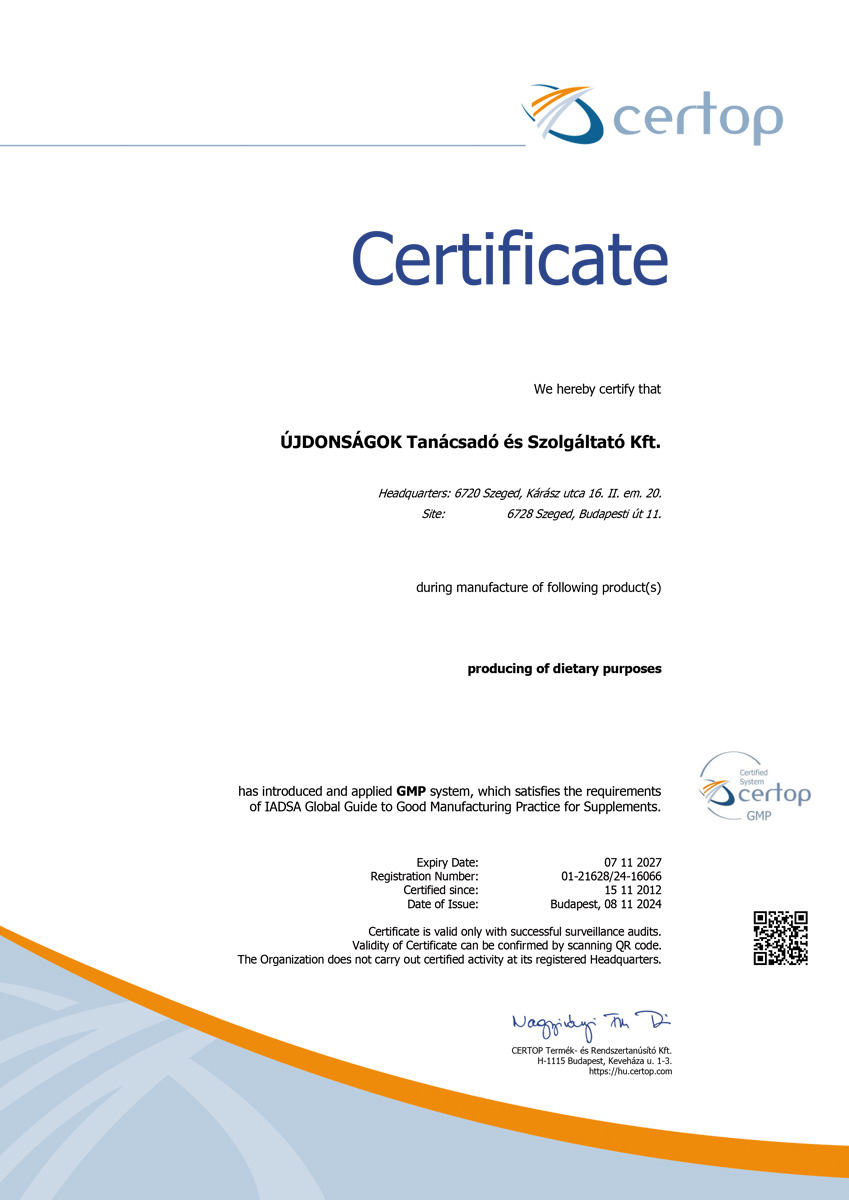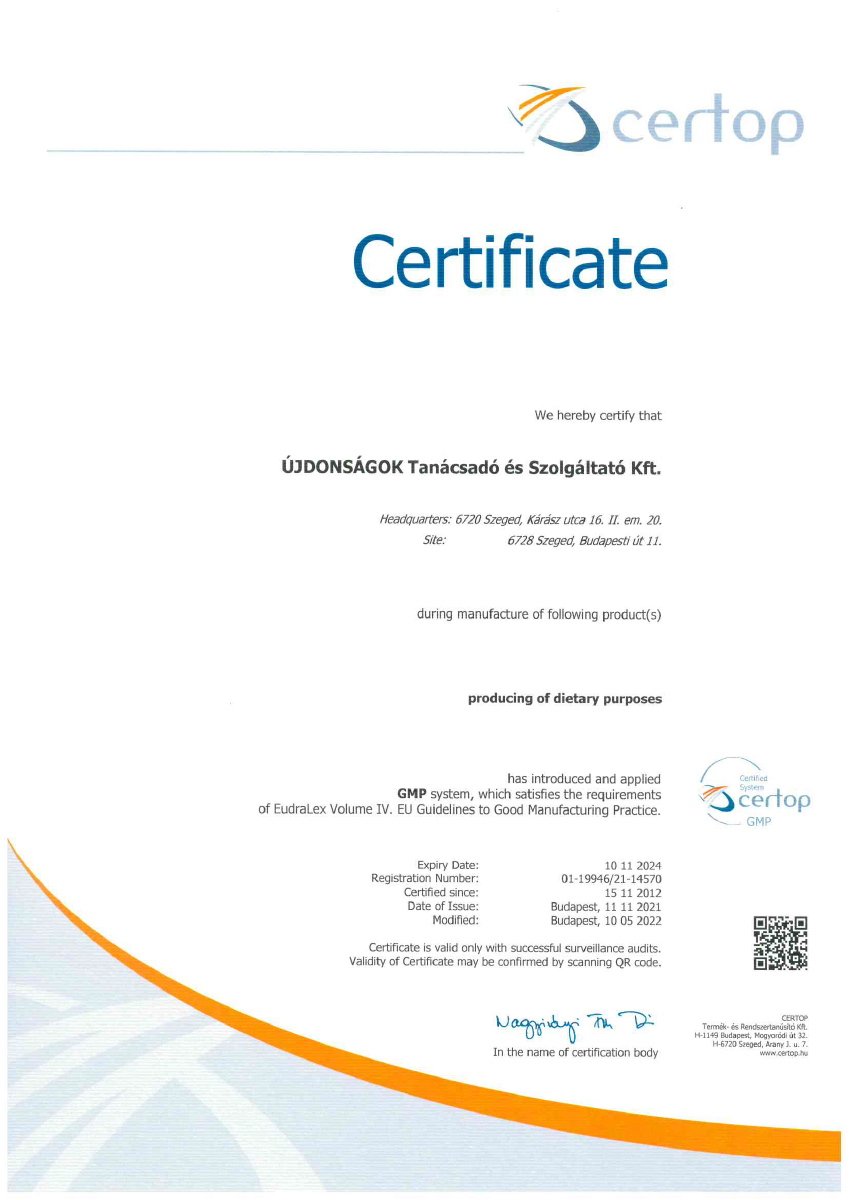 The production site, manufacturing the N.I.C.S. products, received in 2022 for the 11th time the GMP (Good Manufacturing Practice) certification. GMP is the internationally accepted, reliable and traceable standards in which the most effective guidelines, manufacturing procedures, control methods are collected in order to ensure the consistent product safety and quality. It is used generally in the pharmaceutical and food industries. National regulatory agencies coordinates inspections in a form of an audit in every single year to verify the compliance of the manufacturing sites.
