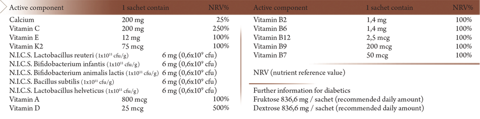 As an innovation we have completed our family of granules with a limited edition product. We have developed a brand new, cocoa taste to make the vitamin consumption even more enjoyable for those who are the most important for us, for our children. Regarding the vitamin and mineral content we insisted on the foregoing proven content of the OYP Kid’s Multivitamin. We supplemented these not with the microflora strains known from our One Year Products but with the specially selected microflora strains distinguished by NICS prefix in their name to ensure the possibility by consuming alternately or combined to support the body with 11 different type of microflora strains.